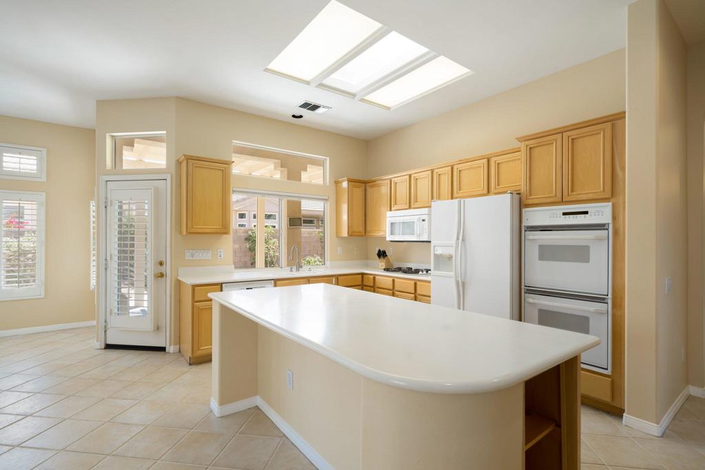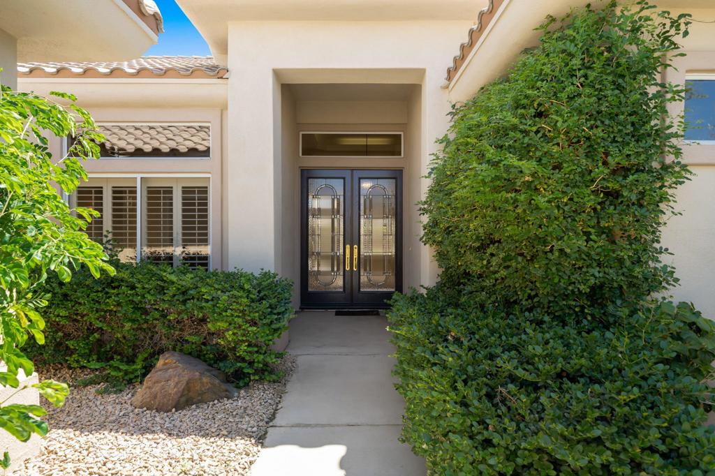 This popular Emerald model boasts a private, south-facing backyard, perfect for enjoying serene outdoor moments. Recently painted, the home welcomes you with a fabulous formal living and dining room, featuring double leaded entry doors and glass sliding doors that offer a view of the beautifully desert-landscaped backyard. Plantation shutters and skylights add brightness and cheer to the space.The large kitchen opens to a cozy family room and breakfast area, creating a seamless flow for family gatherings. The primary suite is a retreat with a bay window, walk-in closet, double vanity, shower, and soaking tub. The guest suite includes a private full bathroom with a shower-tub combination. Additionally, the den/office can serve as a third bedroom and features a half bath, also used as a powder room.The spacious south-facing backyard is an oasis with an extended patio, Alumawood cover, desert landscaping, fruit trees, and high walls ensuring complete privacy. The garage is well-appointed with epoxy floors, a golf cart garage, and ample storage.Located in the wonderful Sun City Palm Desert, this home is part of a nationally renowned active adult community. Residents enjoy access to two golf courses, lakes, waterfalls, pools, gyms, tennis and pickleball courts, bocce ball courts, a billiards room, restaurants, and even its own post office!